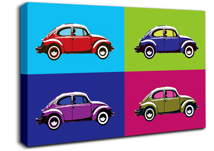 Beetle Pop Art Canvas Print handmade in the UK. Stretched over a 2 inch thick wooden box frame, ready to hang on your wall.
