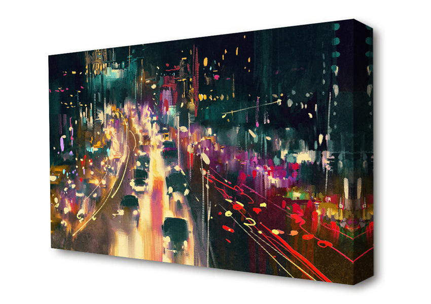 Busy Night Traffic Lights Watercolour Canvas Print handmade in the UK. Stretched over a 2 inch thick wooden box frame, ready to hang on your wall.