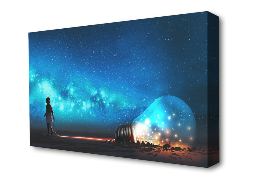 Child Pulling A Lightbulb Canvas Print handmade in the UK. Stretched over a 2 inch thick wooden box frame, ready to hang on your wall.