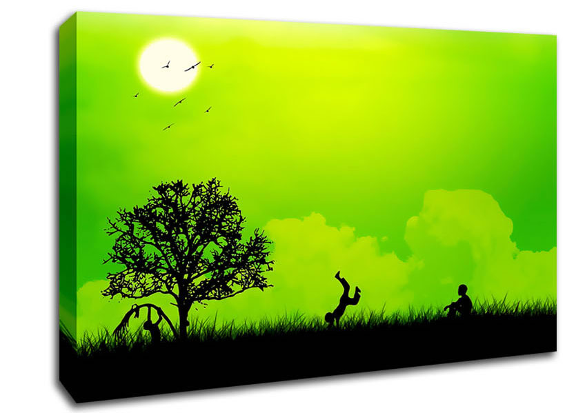 Children Playing Green Canvas Print handmade in the UK. Stretched over a 2 inch thick wooden box frame, ready to hang on your wall.