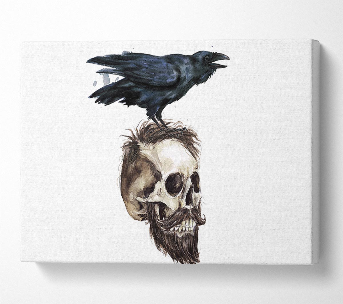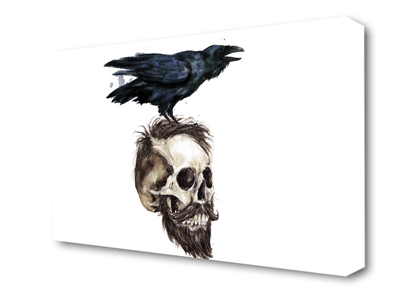 Crow On The Head Of A Skull Canvas Print handmade in the UK. Stretched over a 2 inch thick wooden box frame, ready to hang on your wall.