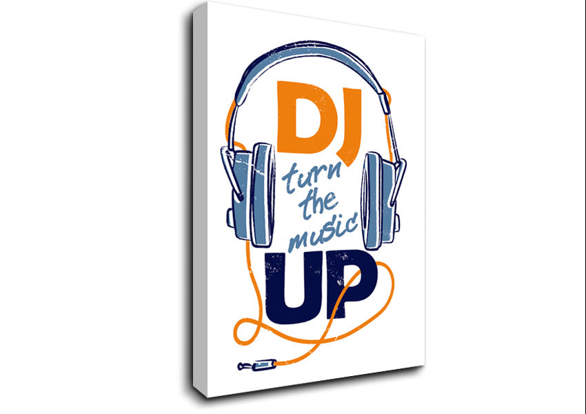 DJ Turn The Music Up Canvas Print handmade in the UK. Stretched over a 2 inch thick wooden box frame, ready to hang on your wall.