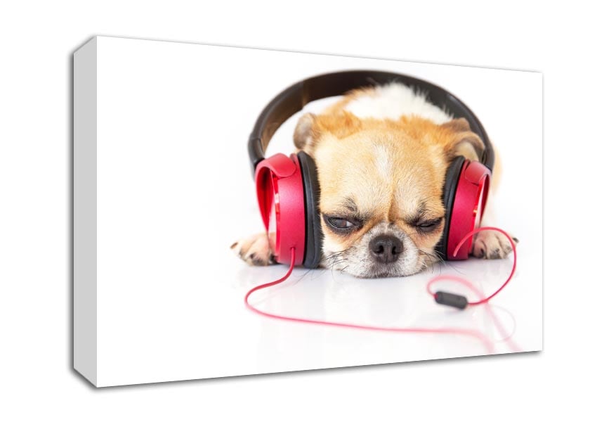 Dog listening to music relaxing Canvas Print handmade in the UK. Stretched over a 2 inch thick wooden box frame, ready to hang on your wall.