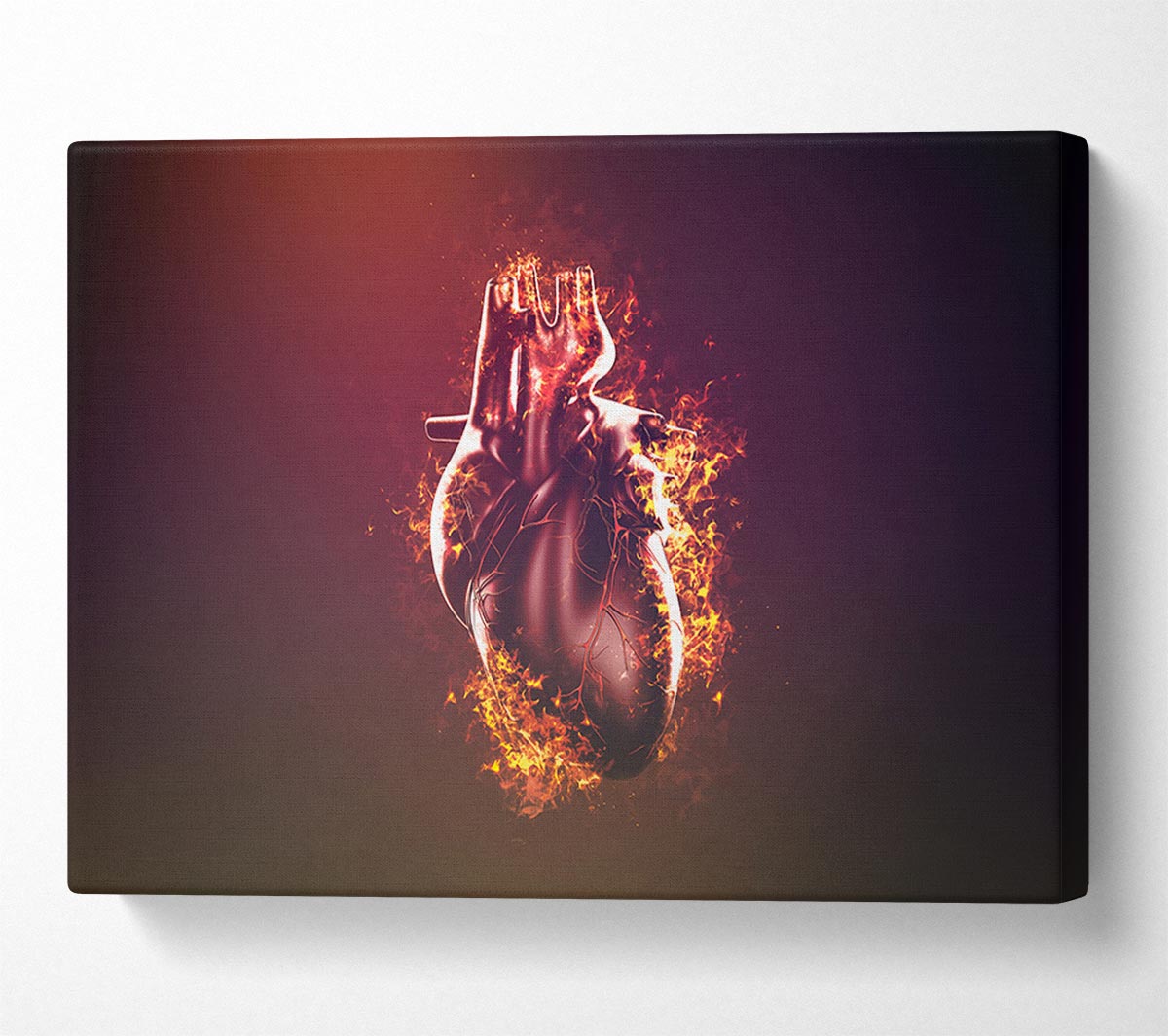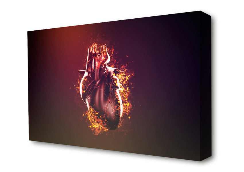 Flaming Heart Canvas Print handmade in the UK. Stretched over a 2 inch thick wooden box frame, ready to hang on your wall.