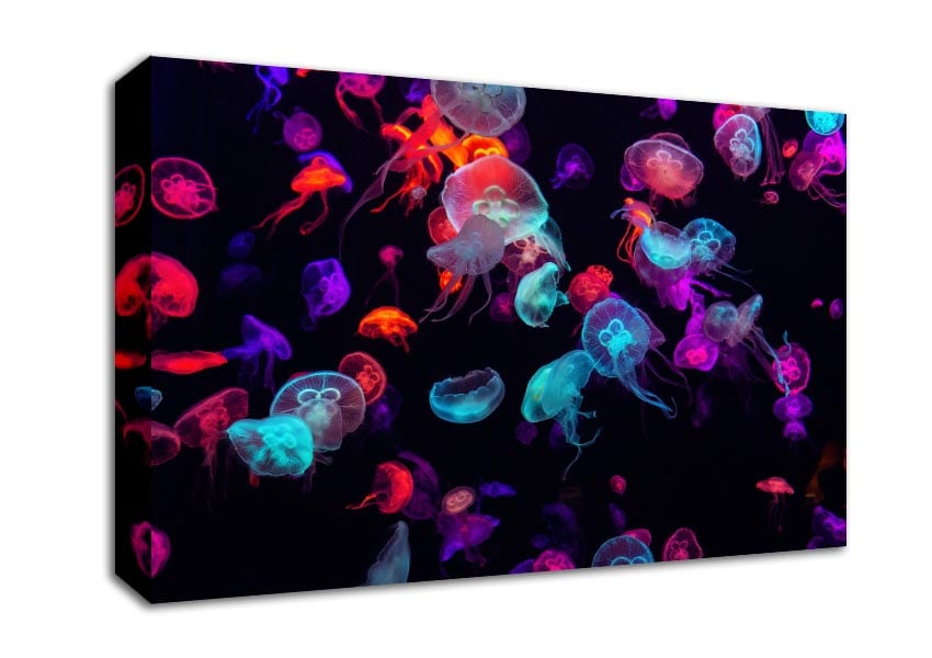 Neon Jellyfish frenzy Canvas Print handmade in the UK. Stretched over a 2 inch thick wooden box frame, ready to hang on your wall.