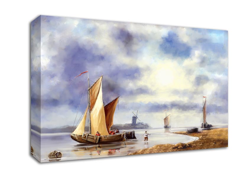 Preparing to dock boat illustration Canvas Print handmade in the UK. Stretched over a 2 inch thick wooden box frame, ready to hang on your wall.