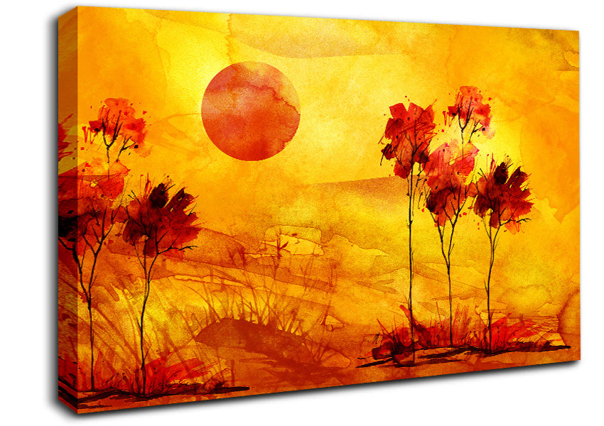 Red Tree Sun Canvas Print handmade in the UK. Stretched over a 2 inch thick wooden box frame, ready to hang on your wall.