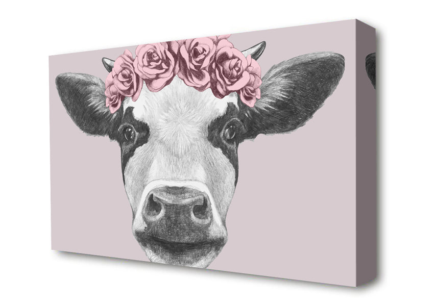 Rose Cow Head Canvas Print handmade in the UK. Stretched over a 2 inch thick wooden box frame, ready to hang on your wall.