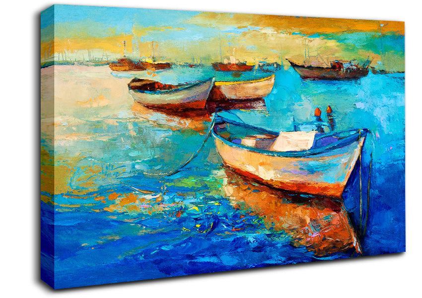 Sail Boats On The Sunset Waters Canvas Print handmade in the UK. Stretched over a 2 inch thick wooden box frame, ready to hang on your wall.