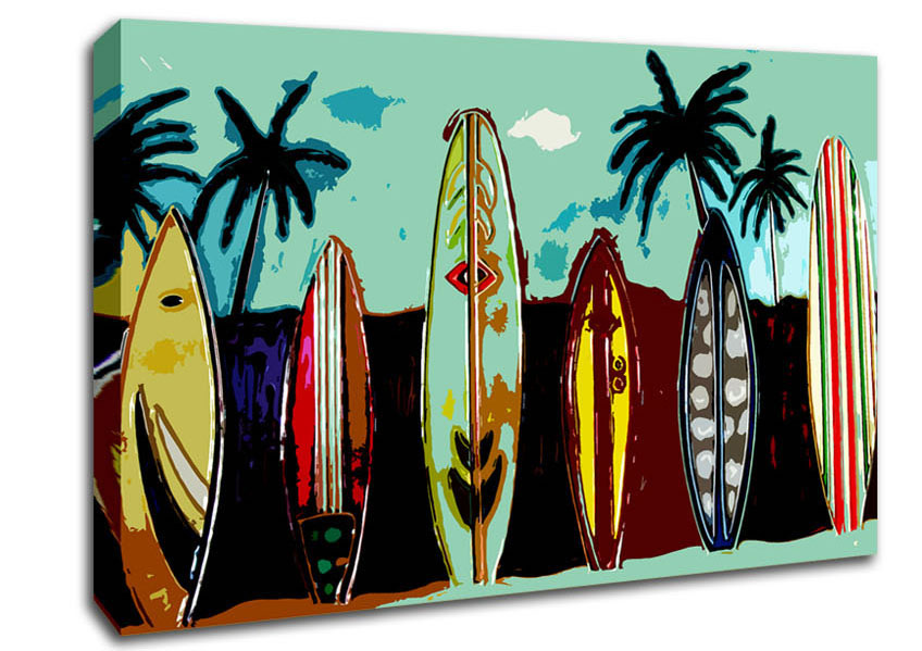 Surfboard Paradise Canvas Print handmade in the UK. Stretched over a 2 inch thick wooden box frame, ready to hang on your wall.