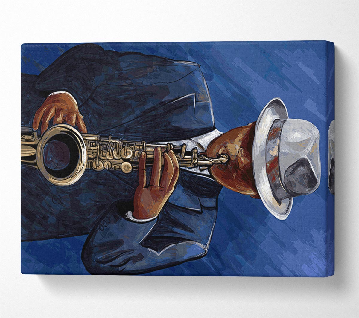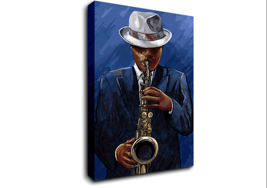 Loves Playing The Saxophone Canvas Print handmade in the UK. Stretched over a 2 inch thick wooden box frame, ready to hang on your wall.