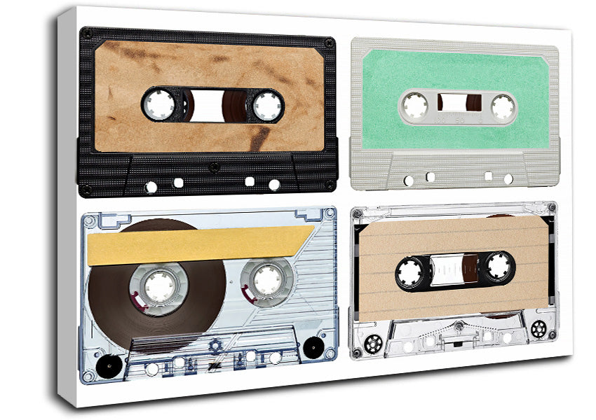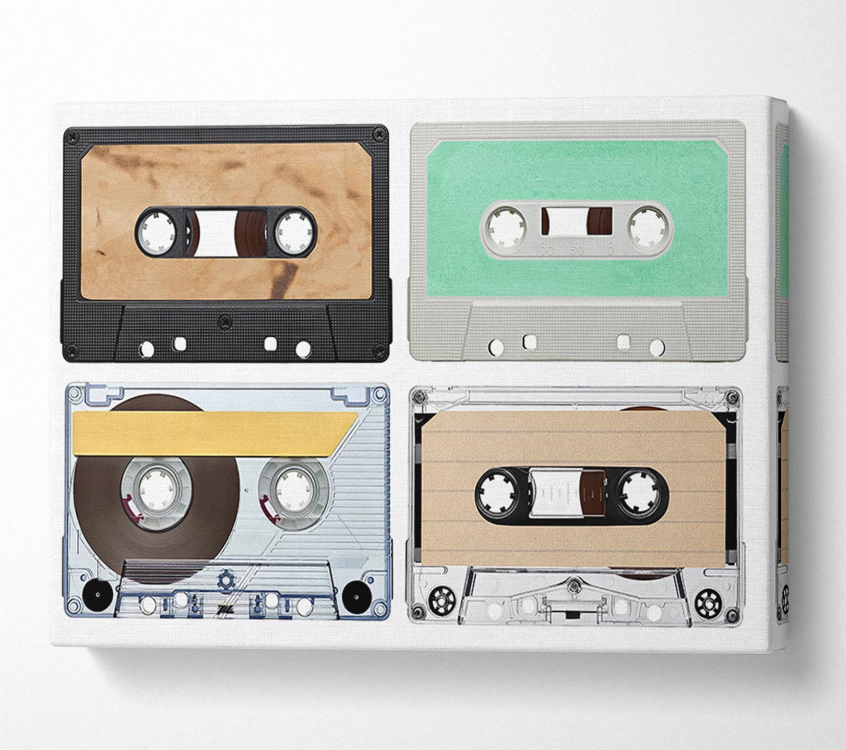 Retro Music Tapes Canvas Print handmade in the UK. Stretched over a 2 inch thick wooden box frame, ready to hang on your wall.