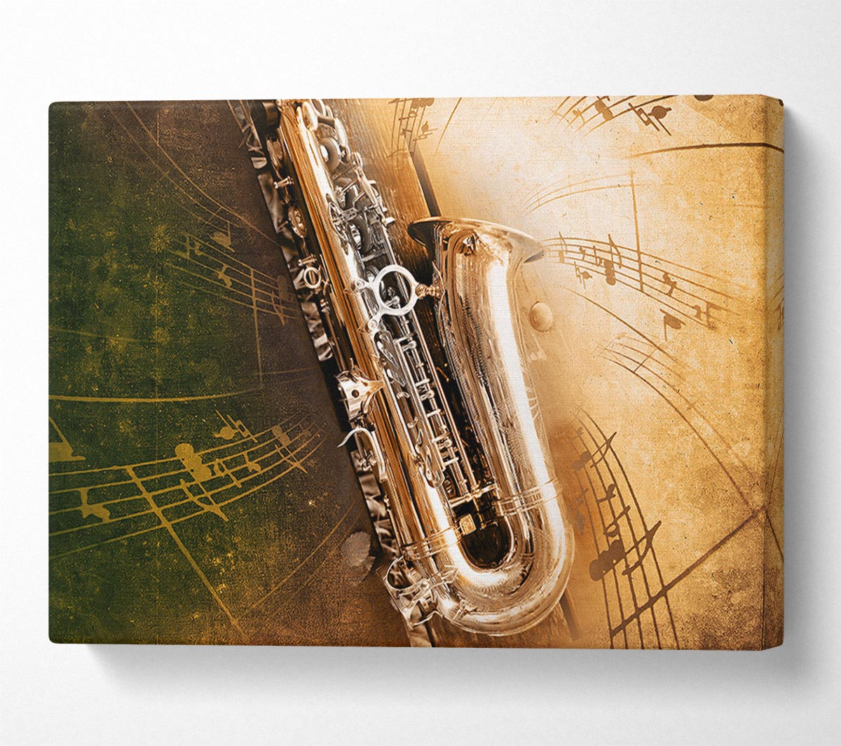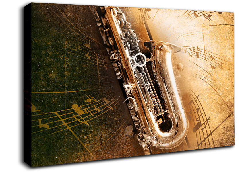 Saxophone Notes Canvas Print handmade in the UK. Stretched over a 2 inch thick wooden box frame, ready to hang on your wall.