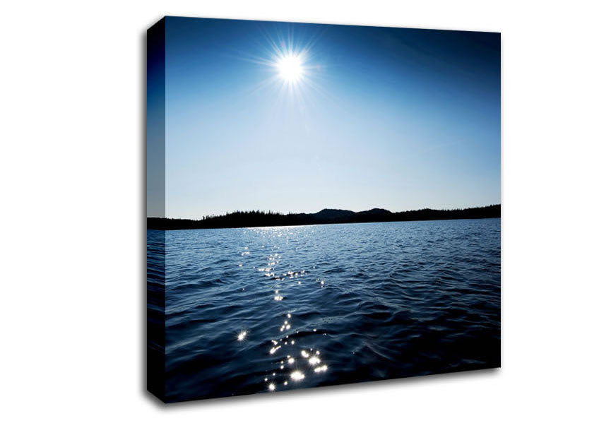 Blue Ocean Sun Square Canvas Print handmade in the UK. Stretched over a 2 inch thick wooden box frame, ready to hang on your wall.