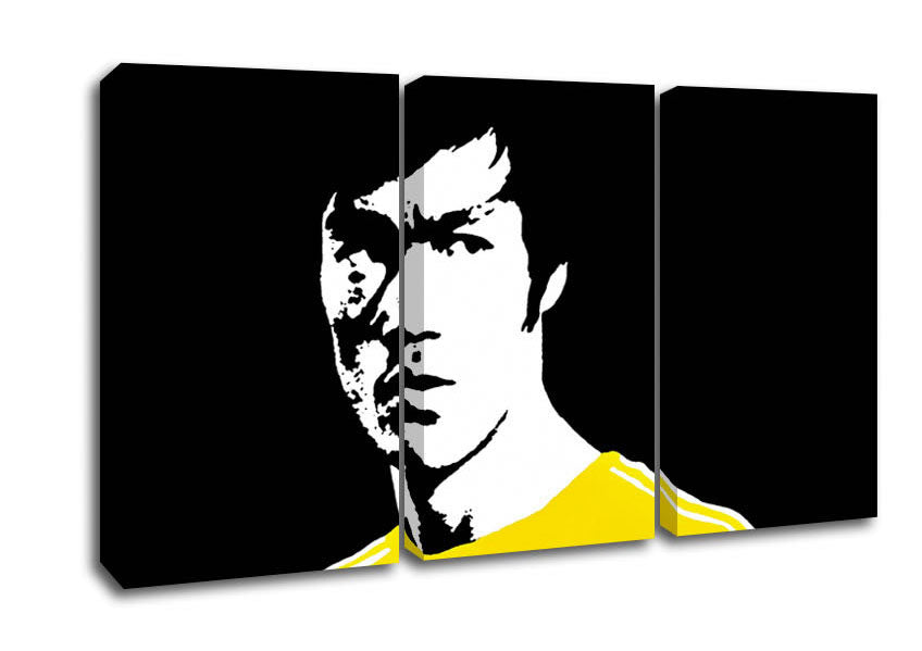 Bruce Lee Dragon Yellow Jump Suit 3 Panel Canvas Print handmade in the UK. Stretched over a 2 inch thick wooden box frame, ready to hang on your wall.