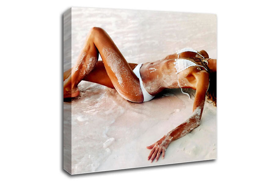 Elle Macpherson In The Sea Square Canvas Print handmade in the UK. Stretched over a 2 inch thick wooden box frame, ready to hang on your wall.