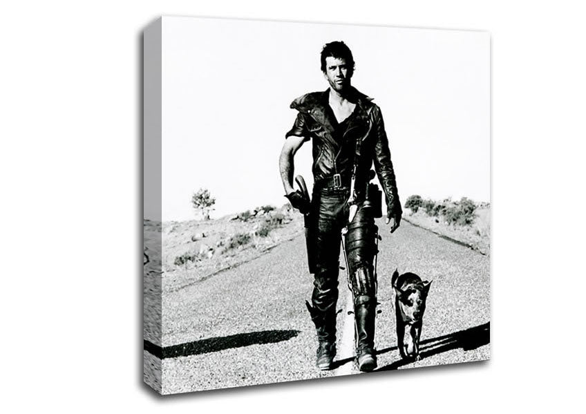 Mad Max Highway Walk With Dog B n W Square Canvas Print handmade in the UK. Stretched over a 2 inch thick wooden box frame, ready to hang on your wall.
