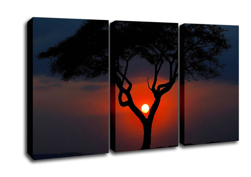 Beautiful Red Sunset Between The Tree 3 Panel Canvas Print handmade in the UK. Stretched over a 2 inch thick wooden box frame, ready to hang on your wall.