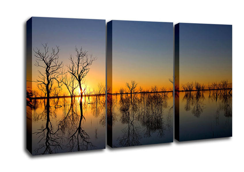 Beautiful Reflections Of The Winter Trees 3 Panel Canvas Print handmade in the UK. Stretched over a 2 inch thick wooden box frame, ready to hang on your wall.