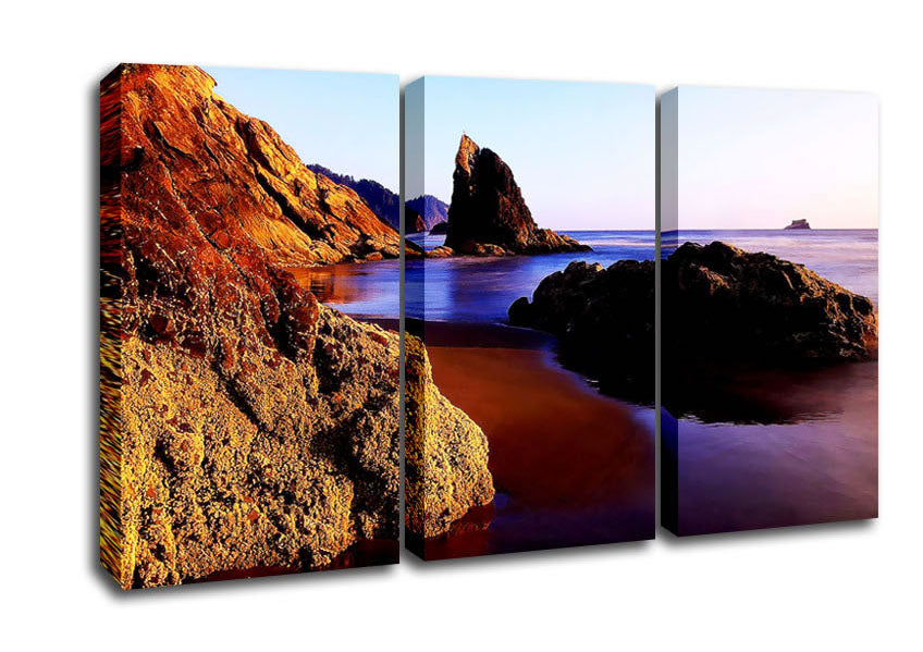 Ocean Rocks 3 Panel Canvas Print handmade in the UK. Stretched over a 2 inch thick wooden box frame, ready to hang on your wall.