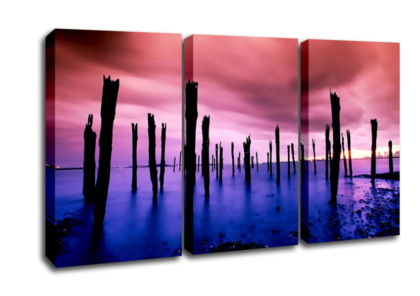 Purple Oceans Pink Skies 3 Panel Canvas Print handmade in the UK. Stretched over a 2 inch thick wooden box frame, ready to hang on your wall.
