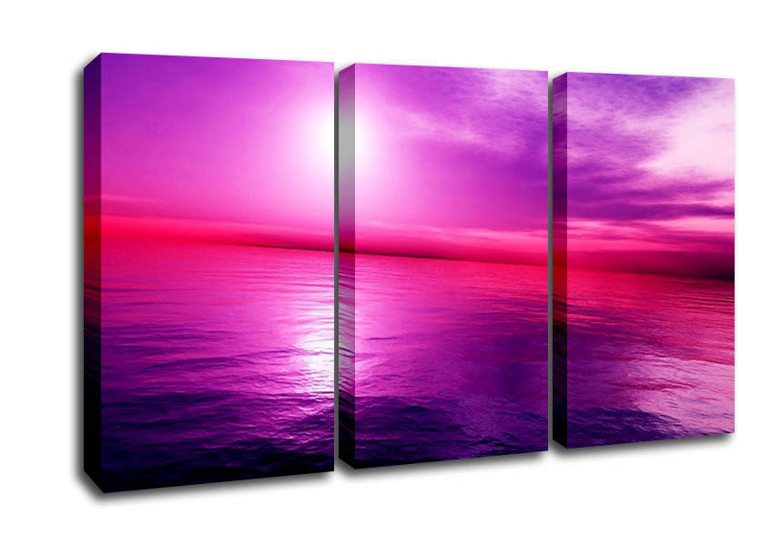 Stunning Lilac Pink Ocean Reflections 3 Panel Canvas Print handmade in the UK. Stretched over a 2 inch thick wooden box frame, ready to hang on your wall.