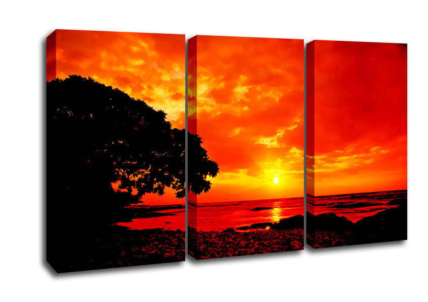 Stunning Orange Skies Over Ocean 3 Panel Canvas Print handmade in the UK. Stretched over a 2 inch thick wooden box frame, ready to hang on your wall.