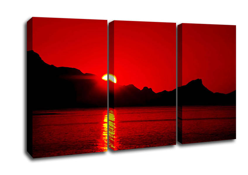 Vibrant Red Ocean Sunset 3 Panel Canvas Print handmade in the UK. Stretched over a 2 inch thick wooden box frame, ready to hang on your wall.