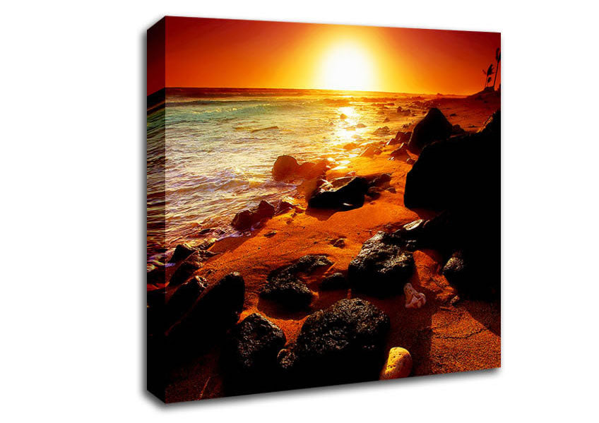 Caramel Sun Blaze Ocean Square Canvas Print handmade in the UK. Stretched over a 2 inch thick wooden box frame, ready to hang on your wall.