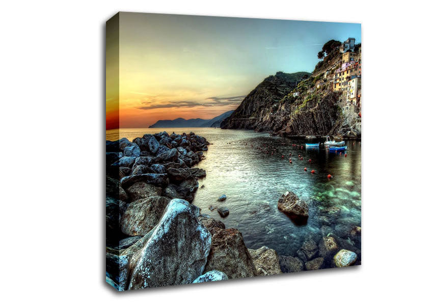 Coastal City Ocean Square Canvas Print handmade in the UK. Stretched over a 2 inch thick wooden box frame, ready to hang on your wall.
