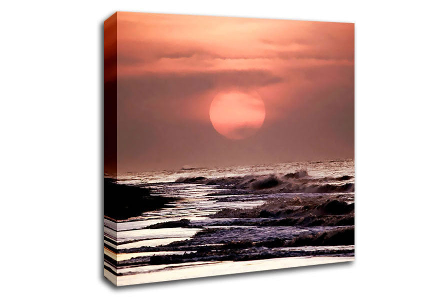 Pink Sunset Ocean Square Canvas Print handmade in the UK. Stretched over a 2 inch thick wooden box frame, ready to hang on your wall.
