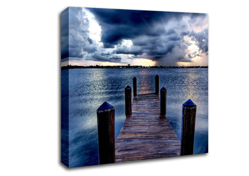 Pontoon Out To Sea Blue Square Canvas Print handmade in the UK. Stretched over a 2 inch thick wooden box frame, ready to hang on your wall.