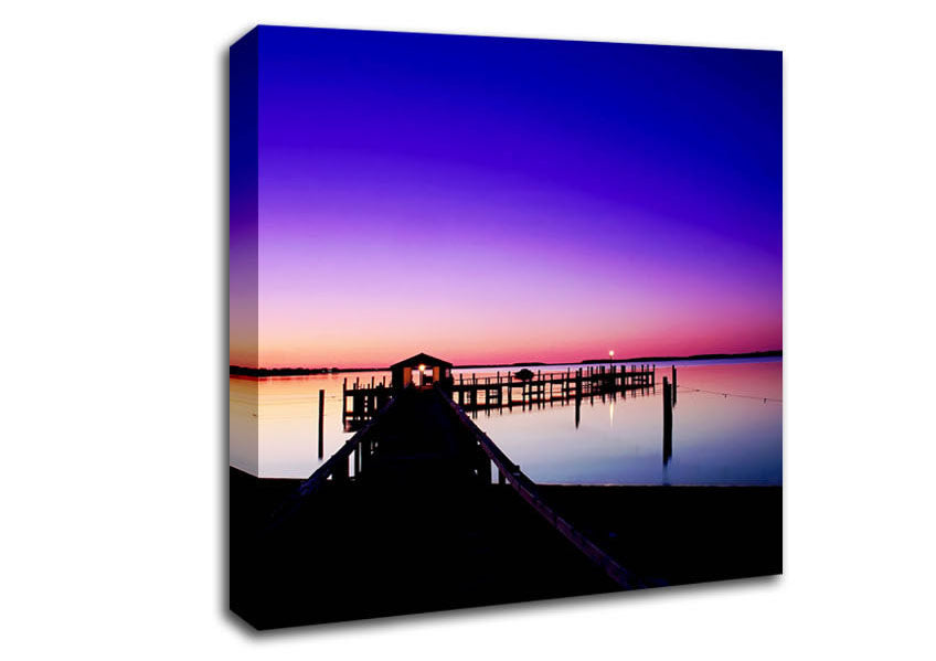 Purple Pier Ocean Square Canvas Print handmade in the UK. Stretched over a 2 inch thick wooden box frame, ready to hang on your wall.