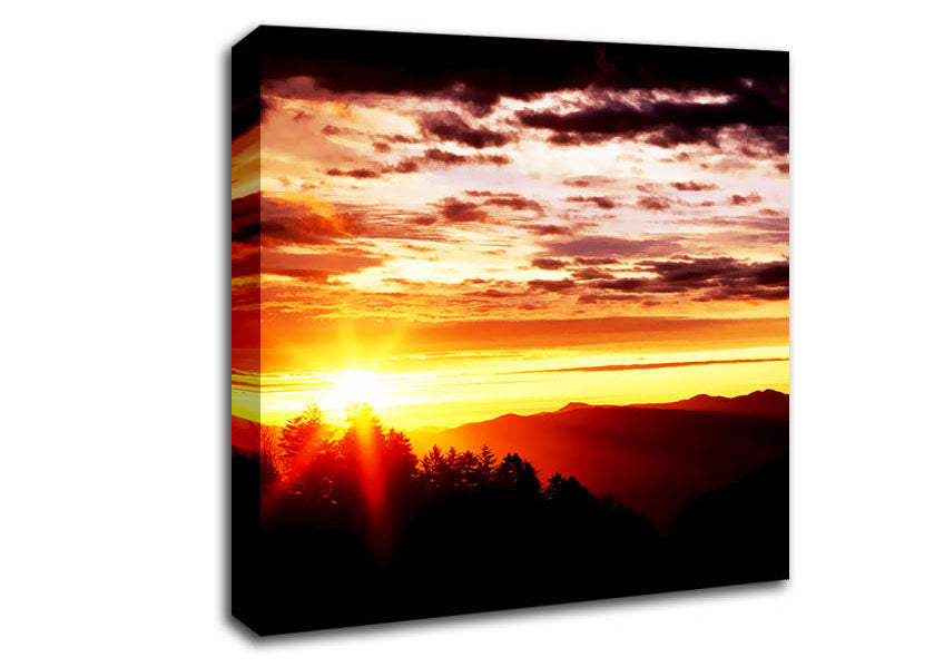 Sunrise Over Treeline Square Canvas Print handmade in the UK. Stretched over a 2 inch thick wooden box frame, ready to hang on your wall.