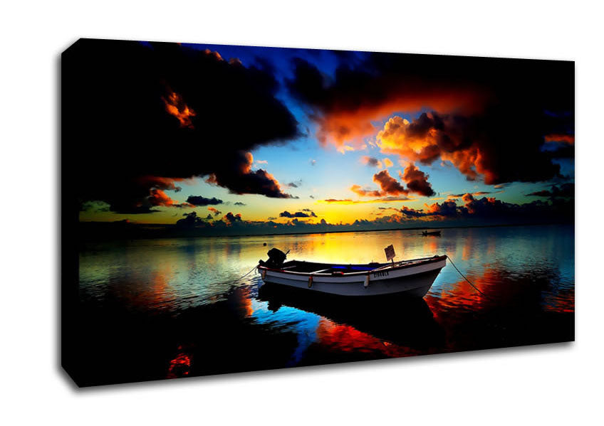 Sunrise Over The Fishing Boat Wide Canvas Print handmade in the UK. Stretched over a 2 inch thick wooden box frame, ready to hang on your wall.