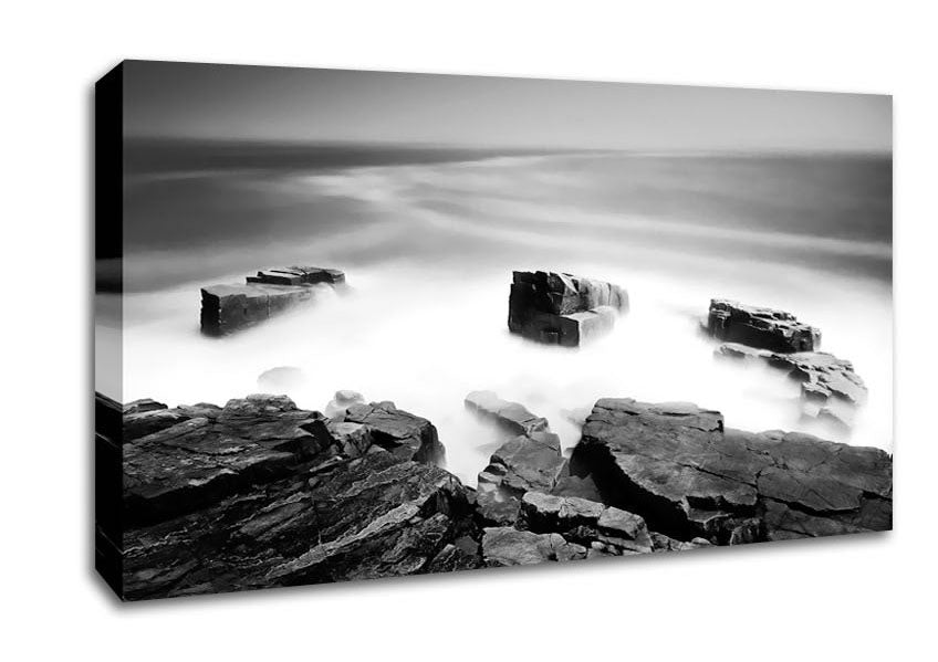 Surreal Ocean Rocks B n W Wide Canvas Print handmade in the UK. Stretched over a 2 inch thick wooden box frame, ready to hang on your wall.