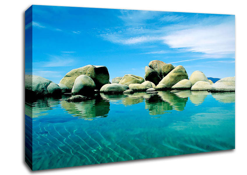 Aqua Rock Pool Canvas Print handmade in the UK. Stretched over a 2 inch thick wooden box frame, ready to hang on your wall.