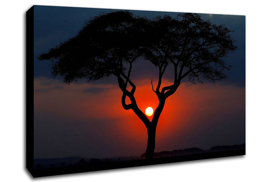 Beautiful Red Sunset Between The Tree Canvas Print handmade in the UK. Stretched over a 2 inch thick wooden box frame, ready to hang on your wall.