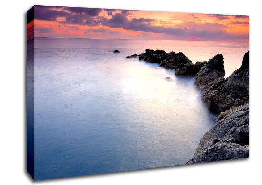 Beautiful Serene Ocean Rocks Canvas Print handmade in the UK. Stretched over a 2 inch thick wooden box frame, ready to hang on your wall.