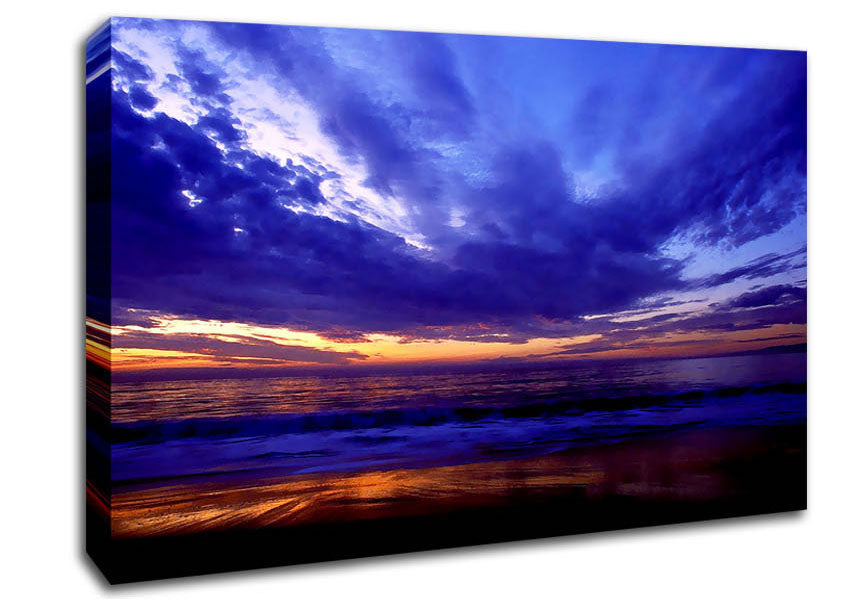 Blue Lilac Sunset Ocean Canvas Print handmade in the UK. Stretched over a 2 inch thick wooden box frame, ready to hang on your wall.