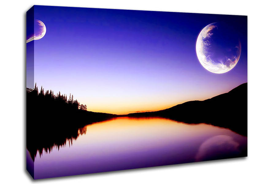 Calm Lake In Another World Purple Canvas Print handmade in the UK. Stretched over a 2 inch thick wooden box frame, ready to hang on your wall.