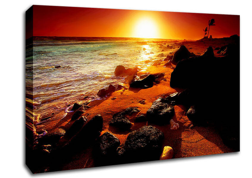 Caramel Sun Blaze Ocean Canvas Print handmade in the UK. Stretched over a 2 inch thick wooden box frame, ready to hang on your wall.