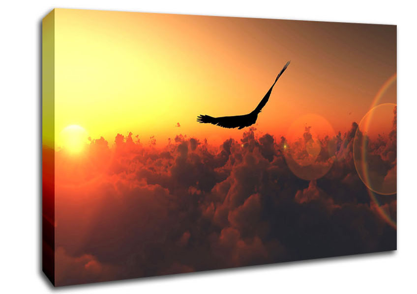 Eagle Flying In The Burnt Orange Sky Canvas Print handmade in the UK. Stretched over a 2 inch thick wooden box frame, ready to hang on your wall.