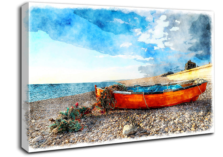Fishermans Boat In The Early Morning Canvas Print handmade in the UK. Stretched over a 2 inch thick wooden box frame, ready to hang on your wall.