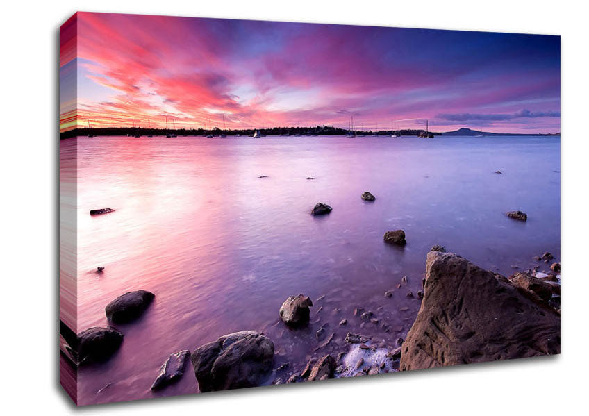 Half Moon Bay Sunset Canvas Print handmade in the UK. Stretched over a 2 inch thick wooden box frame, ready to hang on your wall.