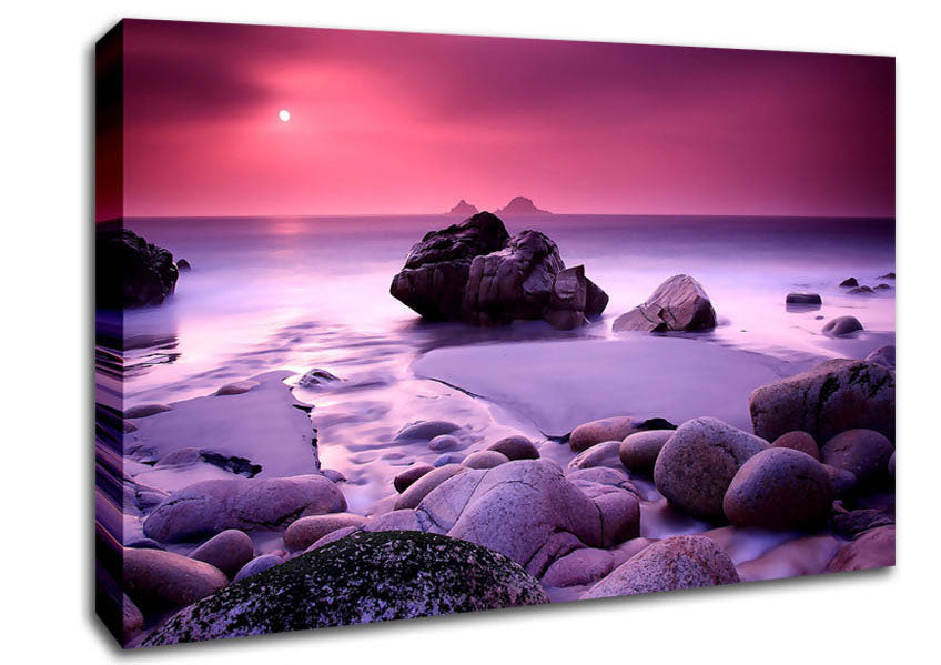 Lilac Beach Rocks Canvas Print handmade in the UK. Stretched over a 2 inch thick wooden box frame, ready to hang on your wall.