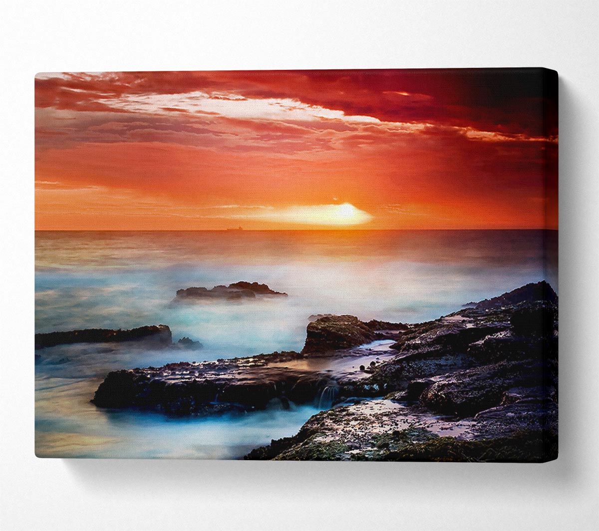 Misty Ocean Sunset Canvas Print handmade in the UK. Stretched over a 2 inch thick wooden box frame, ready to hang on your wall.