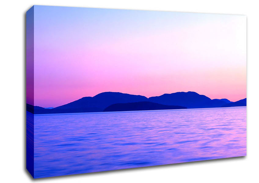 Mountain Ocean Calm Canvas Print handmade in the UK. Stretched over a 2 inch thick wooden box frame, ready to hang on your wall.
