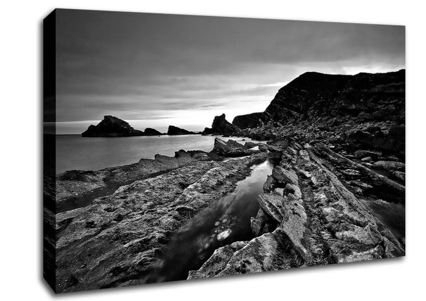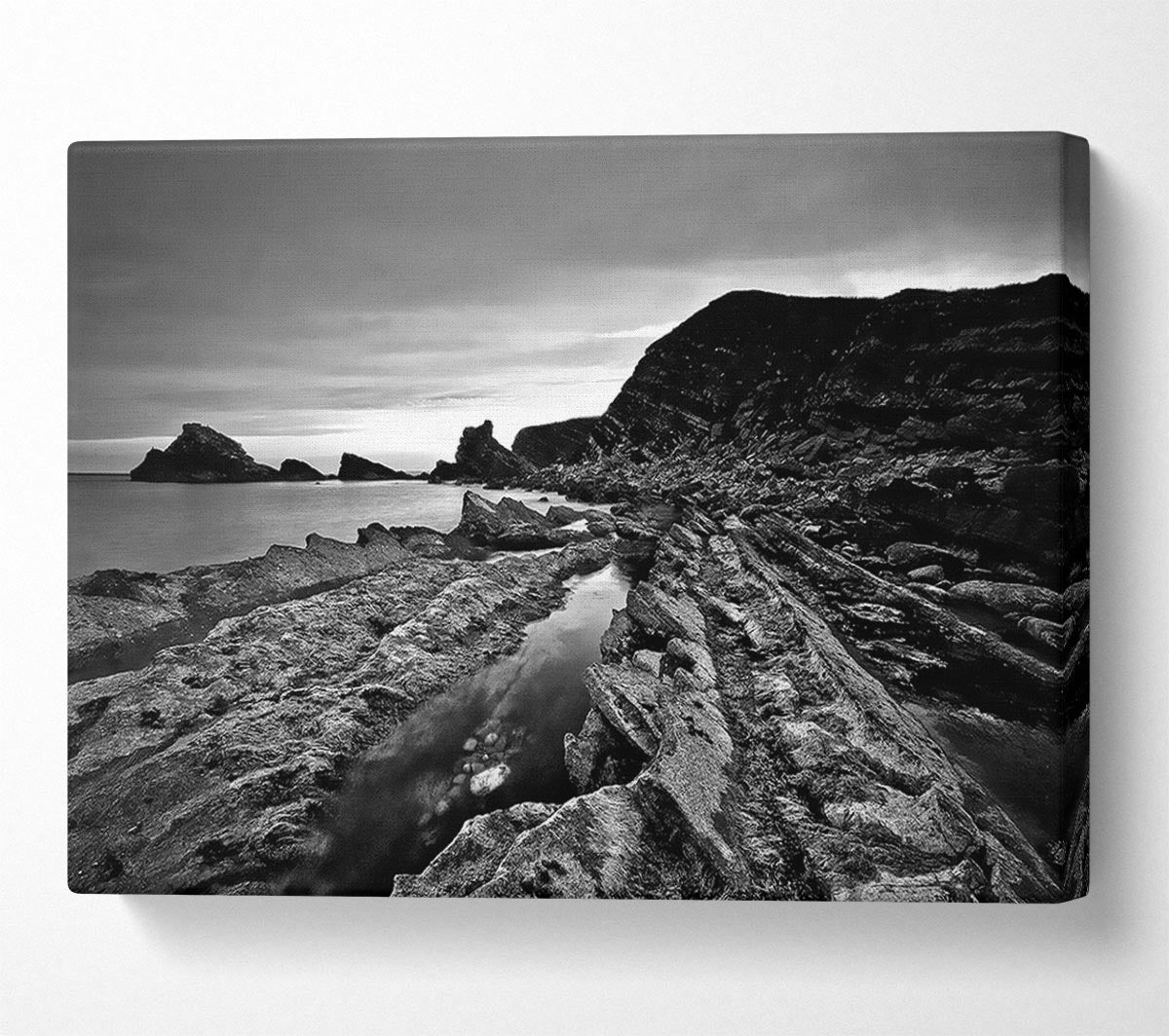 Ocean Rock Formation B n W Canvas Print handmade in the UK. Stretched over a 2 inch thick wooden box frame, ready to hang on your wall.