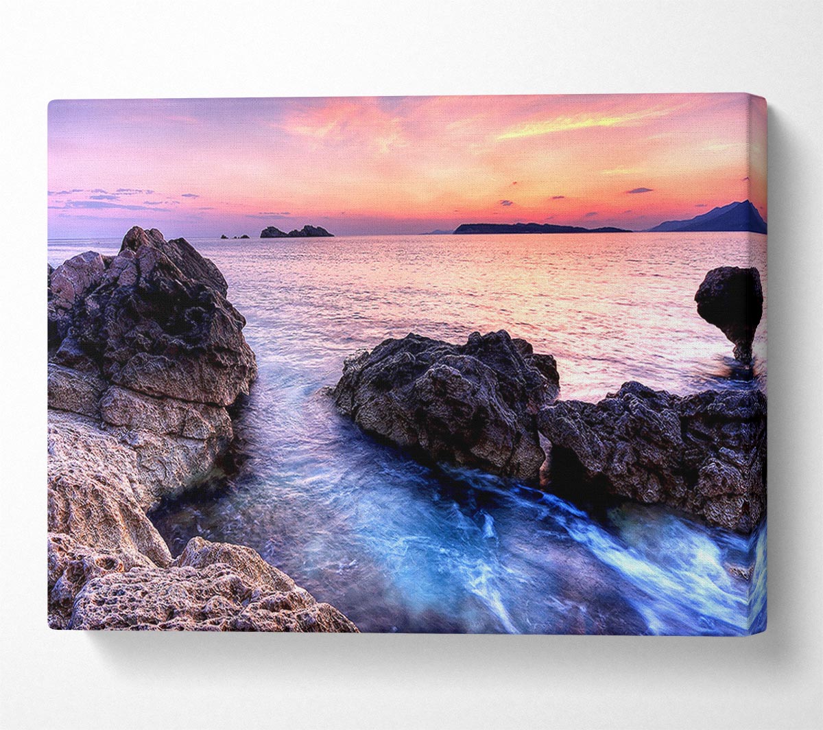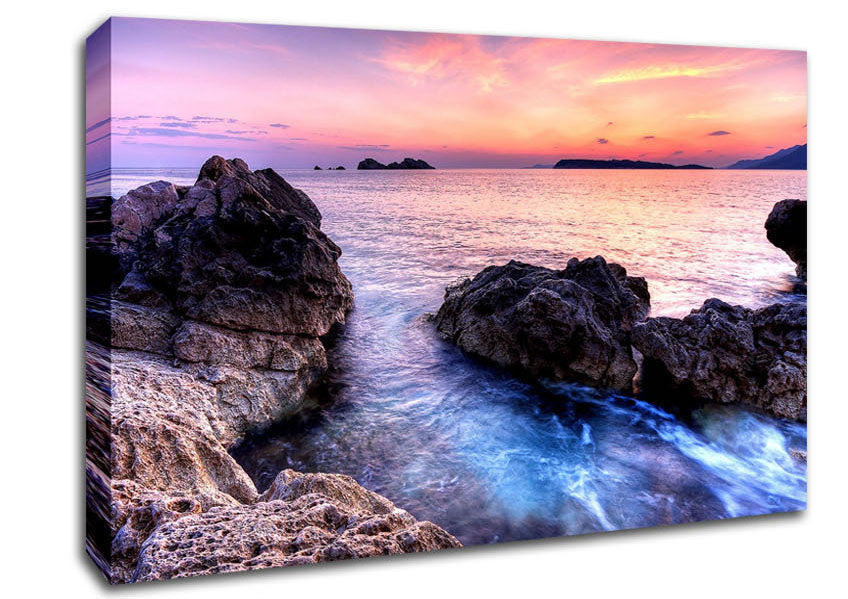 Ocean Rocks At Dawn Canvas Print handmade in the UK. Stretched over a 2 inch thick wooden box frame, ready to hang on your wall.